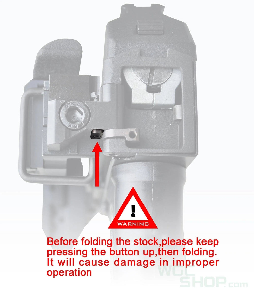 Note: Before folding the stock, please keep pressing the button up, then folding. If will cause damage in improper operation.