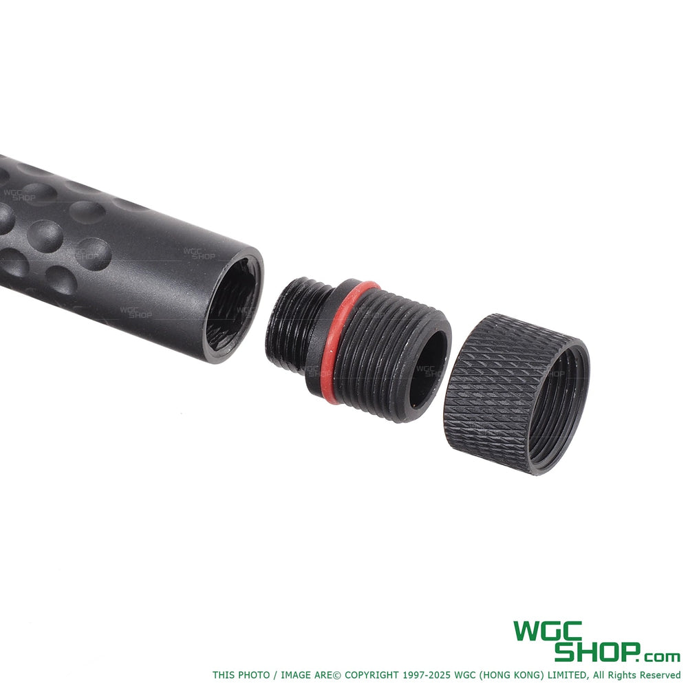 PTS ZEV OZ9 outer barrel has an 11mm (CW) thread. Includes a thread adapter (11mm CW to 14mm CCW) and thread protector. This allows it to work with mock suppressors and tracers