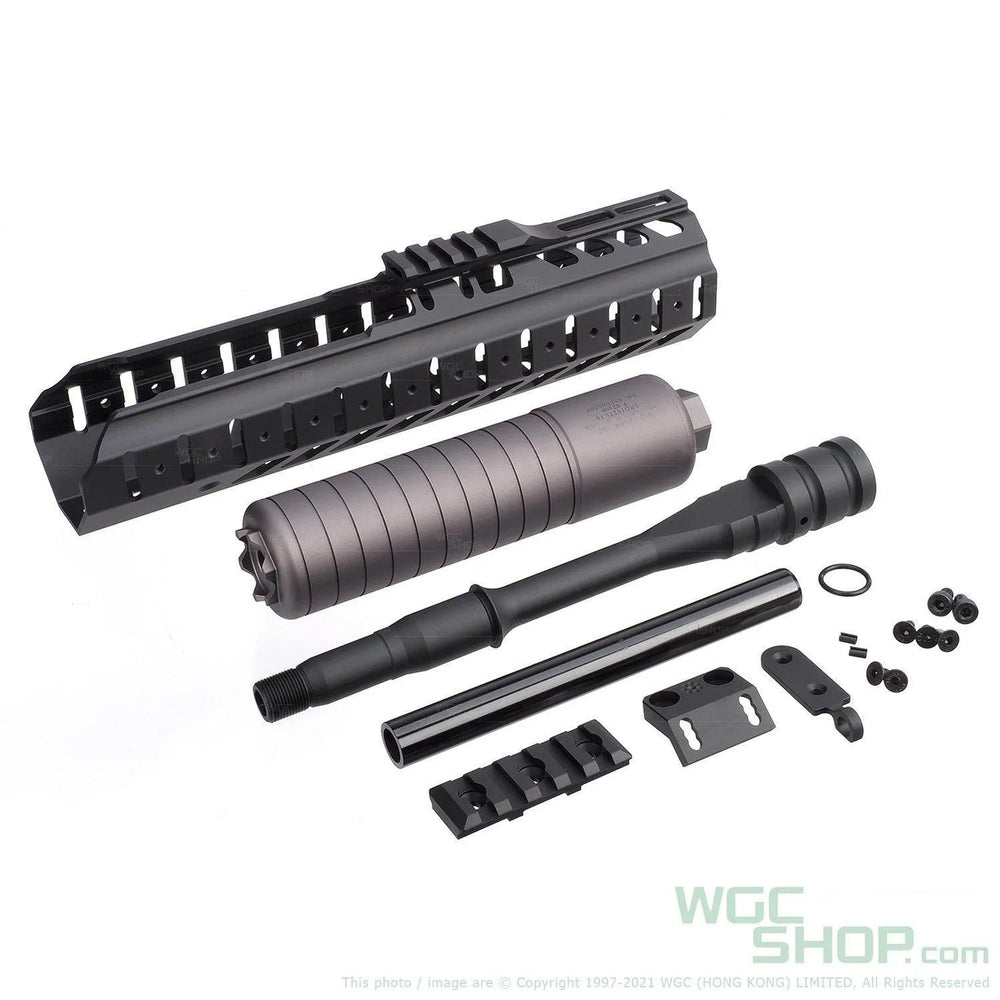 • Packages Included 9inch Outer Barrel / SRD762 Dummy Silencer ( Grey Anodized ) / Light Mount And 5 Slots Rail Panel / Dog Leg