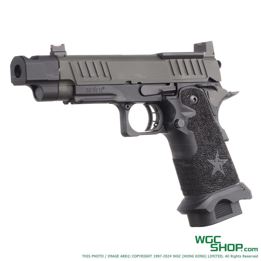 The EMG / ARMY PLUS STACCATO C2 with comp gas blowback Airsoft ( Steel Parts Version ), come with metal slide, outer barrel and middle frame, 20mm lower rail, polymer star pattern non-slip texture grip, fiber optic front sight